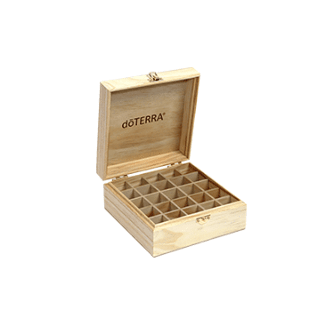 Hecha a medida para contener 25 aceites esenciales, la caja de madera grabada con el logotipo es liviana y compacta, lo que facilita el transporte de tus aceites a donde quiera que vayas. También sirve como una hermosa vitrina para tus aceites al hacer presentaciones. Dimensiones de la caja: 6 ½ x 6 ½ x 3 pulgadas.